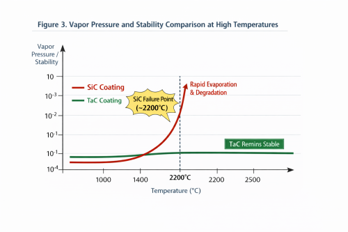 ความเสถียรทางอุณหพลศาสตร์ที่ไม่มีใครเทียบได้: แทนทาลัมคาร์ไบด์ (TaC) มีจุดหลอมเหลวที่น่าทึ่งที่ 3880°C จากการวิจัยใน Journal of Crystal Growth การเคลือบ SiC ได้รับการ "การระเหยที่ไม่สอดคล้องกัน" ที่อุณหภูมิสูงกว่า 2,200°C โดยที่ซิลิคอนจะระเหิดได้เร็วกว่าคาร์บอน ทำให้เกิดการย่อยสลายของโครงสร้างและการปนเปื้อนของอนุภาค ในทางตรงกันข้าม ความดันไอของ TaC คือ 3 ถึง 4ที่มีขนาดต่ำกว่า SiC เพื่อรักษาสนามความร้อนที่บริสุทธิ์สำหรับการเติบโตของคริสตัล